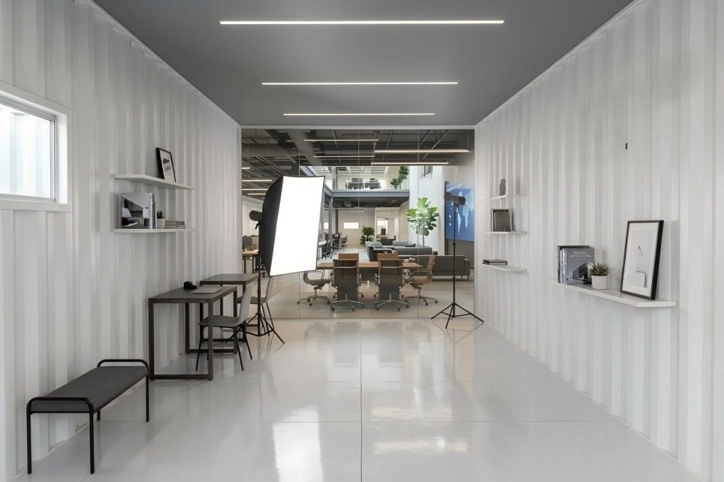 One of the key areas within this creative office environment is the container photography studio,The studio uses the container’s industrial structure as a backdrop, combined with lighting systems to create a professional photography environment,This design not only saves space but also gives the studio a distinctive visual style,Such spaces are especially useful for advertising agencies, content creators, and design teams
