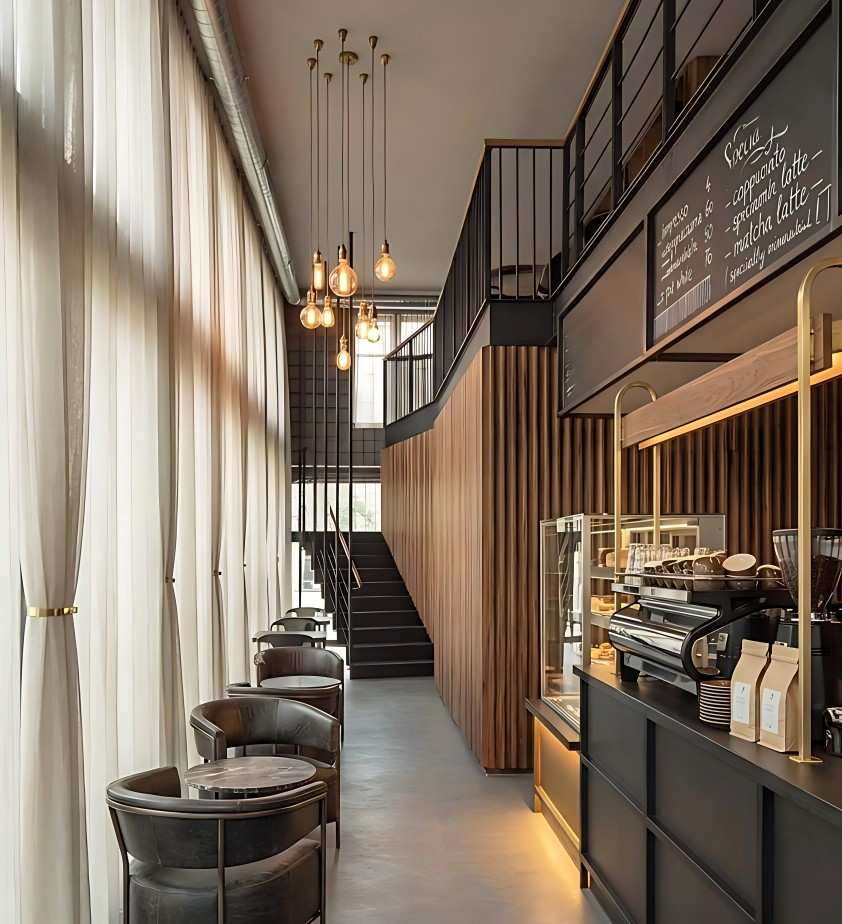 Inside the café, decorative partitions are used to define different functional zones without compromising openness. Curtains and soft furnishings are carefully coordinated with the interior design, adding flexibility and visual harmony,The layout supports both individual customers and group seating, making it suitable for social gatherings, work, or relaxation